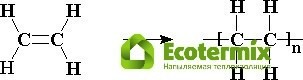 Как видно на схеме, мономер обладает двумя атомами углерода и четырьмя атомами водорода, простейшее звено полимерной цепи имеет ту же структуру, в отличие от продуктов реакций поликонденсации.