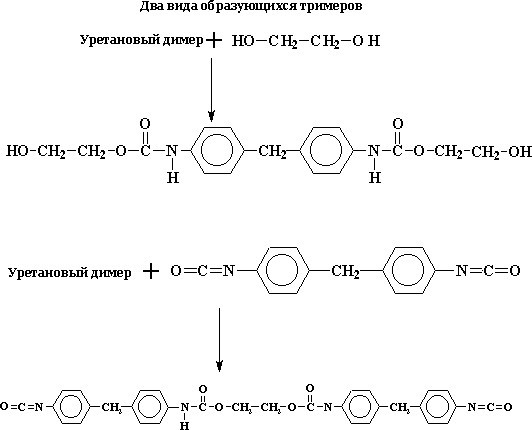 Уретановый димер имеет две различные функциональные группы на своих концах – изоцианатную с одной и гидроксильную с другой. Это свойство позволяет димеру реагировать как с другими изоцианатами или спиртами с образованием тримера, так и с другими димерами, тримерами и более высокомолекулярными уретановыми олигомерами.