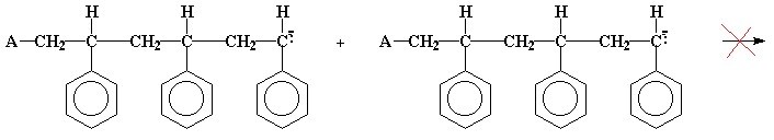 Как следует из схем реакции выше, в процессе полимеризации стирола, только мономеры стирола могут присоединяться (1) к растущей цепи полистирола. Две растущие цепи (2) не вступают во взаимодействие. Это основная особенность реакции цепной полимеризации, которая отличает данный процесс от ступенчатой полимеризации.
