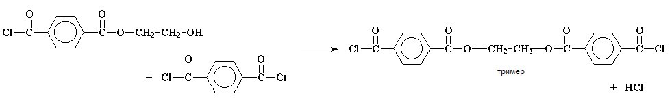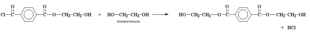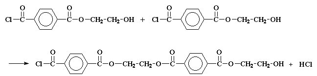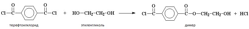 Рассмотрим процесс ступенчатой полимеризации на примере взаимодействия двух мономеров: терефталоилхлорида и этиленгликоля. Взаимодействие этих двух компонентов приводит к образованию полиэфира, который называется полиэтилентерефталат.